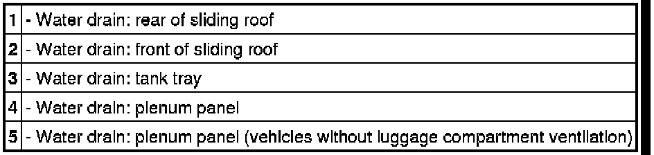 The water drains -1- and -2- can be found on both sides of the vehicle (only vehicles with sliding roof).