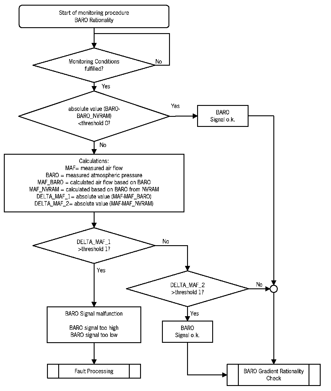 At engine start the difference between the measured atmospheric pressure and the atmospheric pressure, read out from NVRAM, is compared to a calibratable threshold. If this difference exceeds the threshold, first a difference between the measured air flow and the calculated air flow based on the measured atmospheric pressure and second a difference between the measured air flow and the calculated air flow based on the atmospheric pressure from NVRAM are calculated. Then it is evaluated with the before calculated differences whether there is an atmospheric pressure signal malfunction. In any case if no atmospheric pressure signal malfunction is detected the BARO Gradient Rationality Check is still executed.