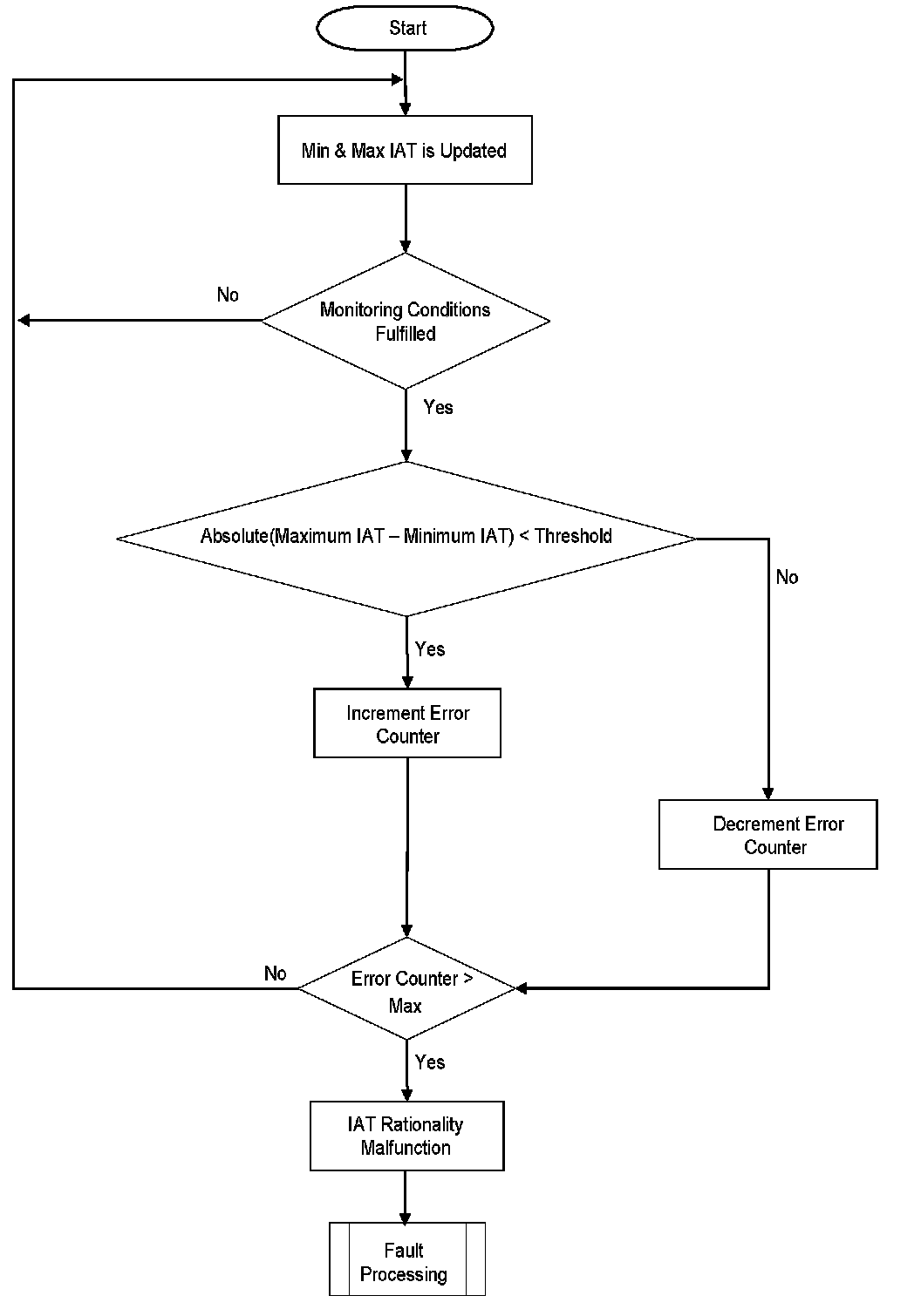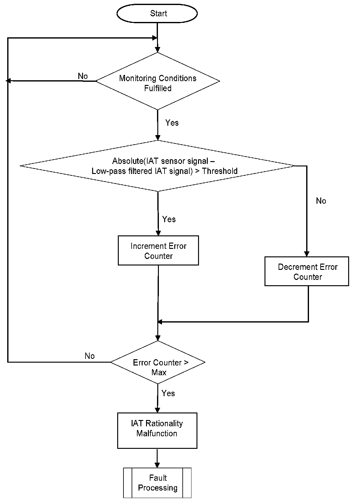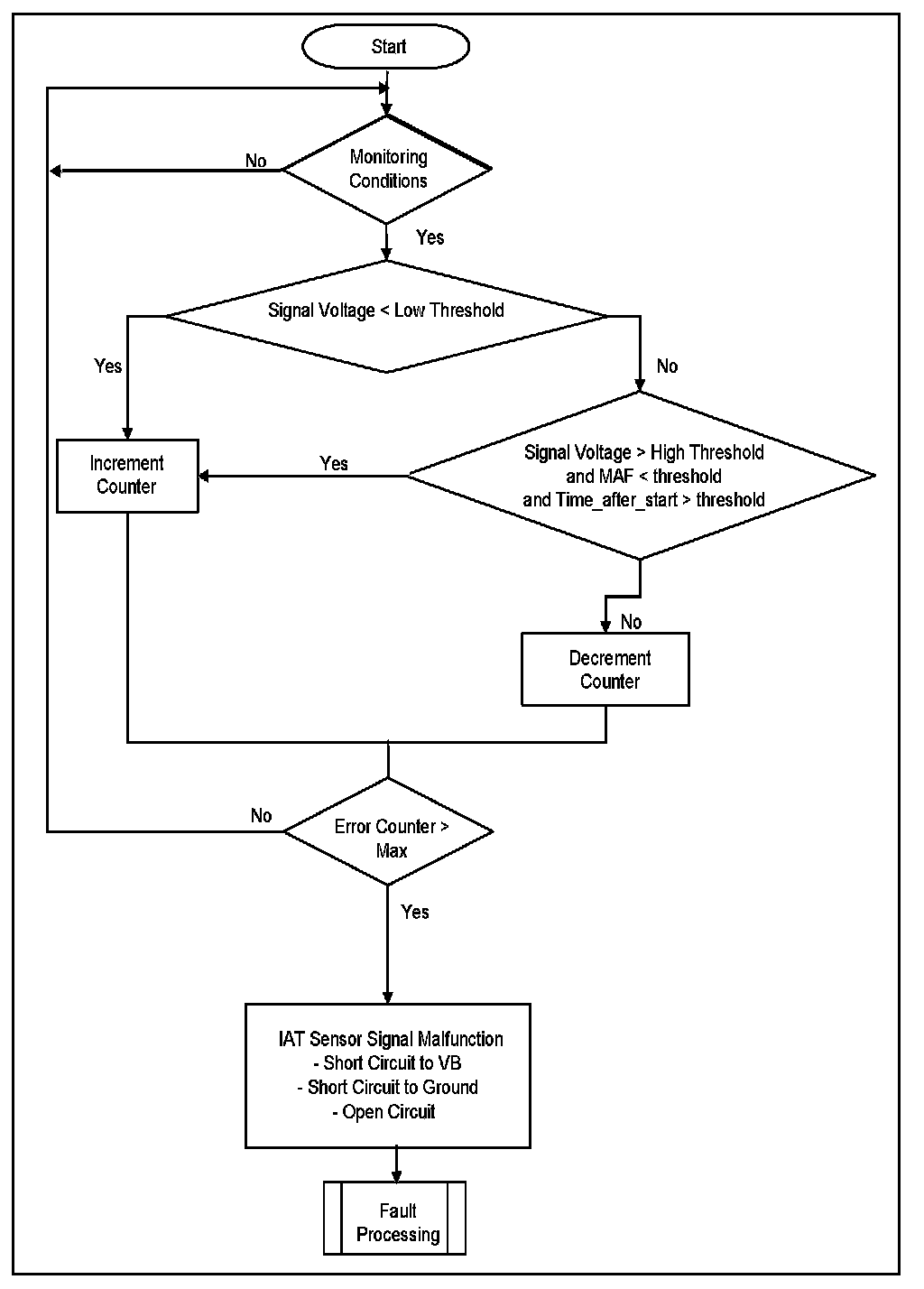 This diagnosis checks IAT for a Stuck signal. If the vehicle was driven for a minimum required distance and time-after-start, then the change in the IAT signal during this period should be above a calibrate able threshold. If this is not the case, a stuck IAT signal is detected.