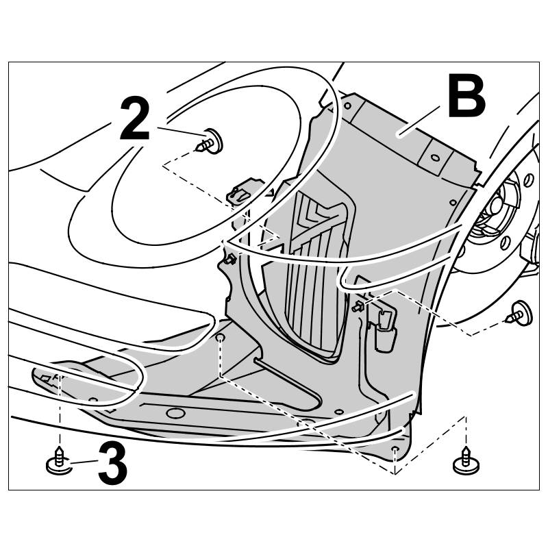 1. Unscrew fastening screws -2, 3- and remove wheel housing liner -B-.