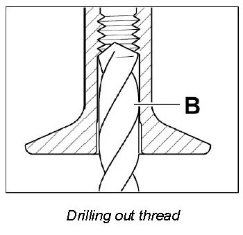 Drill out old thread as far as the base of the thread using a drill bit contained in the M10 or M14 kit B.