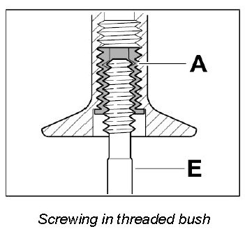 Screw threaded bush A in fully (note bush length classification) using the screw-in tool E.