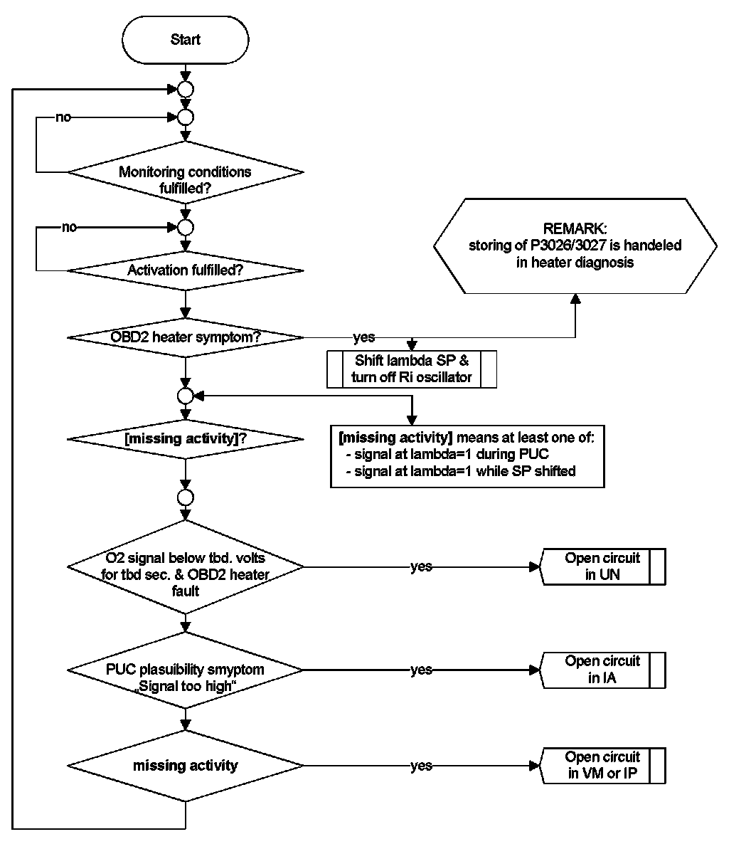 An open circuit in line Virtual Ground or in the line Pumping current can be detected if the sensor signal sticks near lambda 1. The sensor non-activity can be detected by the Oxygen Sensor Signal Monitoring During Fuel Cut-off (signal voltage below e.g. 2.1 V) in fuel cut off or WRAF sens activity check.