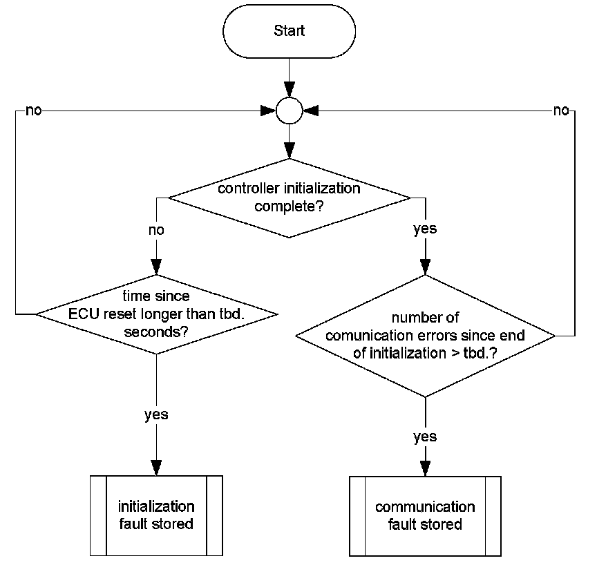 After an ECU reset, the WRAF sensor controller is started and the diagnosis checks if the initialization has been performed in the allowed time. If not successful, then a DTC will be stored. If this is successful, then the last and current values of the communication error counter are compared in every diagnosis cycle. If differences are found too often, then the communication between CPU and sensor controller has a problem and the corresponding fault code is set.
