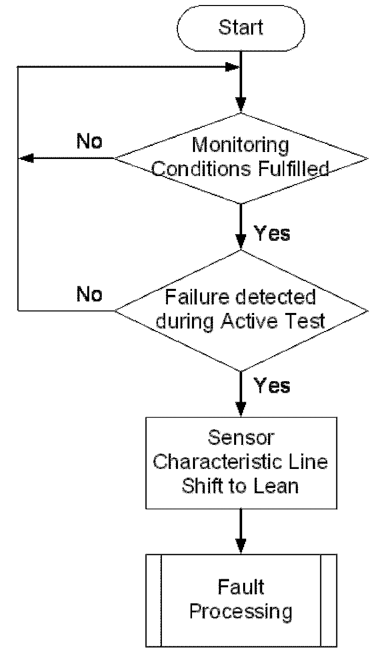 If the sensor shows an augmented gain, i.e. the sensor signal is higher than the nominal characteristic line, the plausibility test during the fuel cutoff phase shall detect this symptom (signal voltage above e.g. 5.6 V) during fuel cut off) and an Open Circuit is assigned to the line Trim Current.