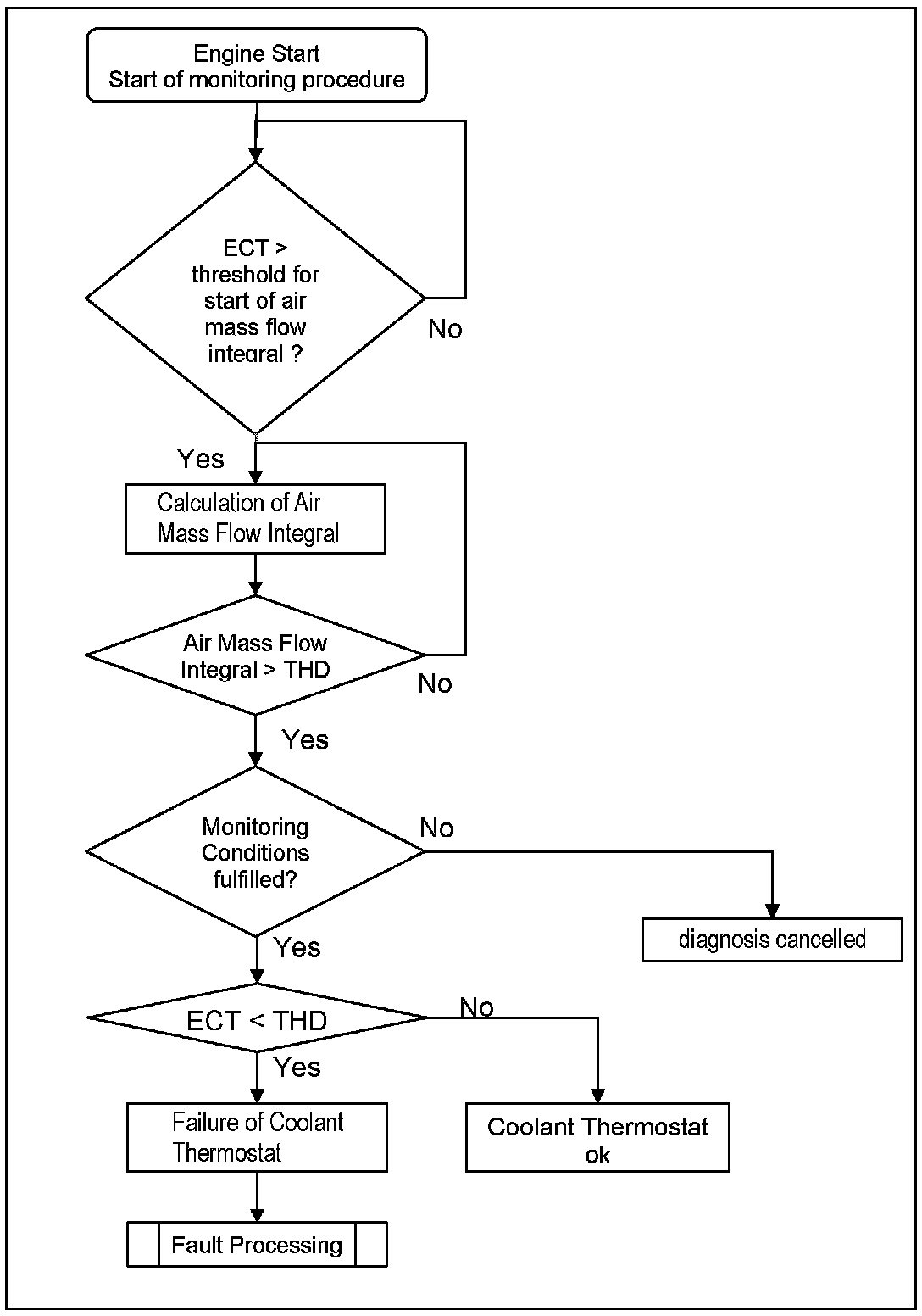 Before a malfunctioning coolant thermostat is entered into failure memory, several monitoring conditions have to be met. Also external failures are checked to inhibit the thermostat diagnosis for this driving cycle if necessary.
