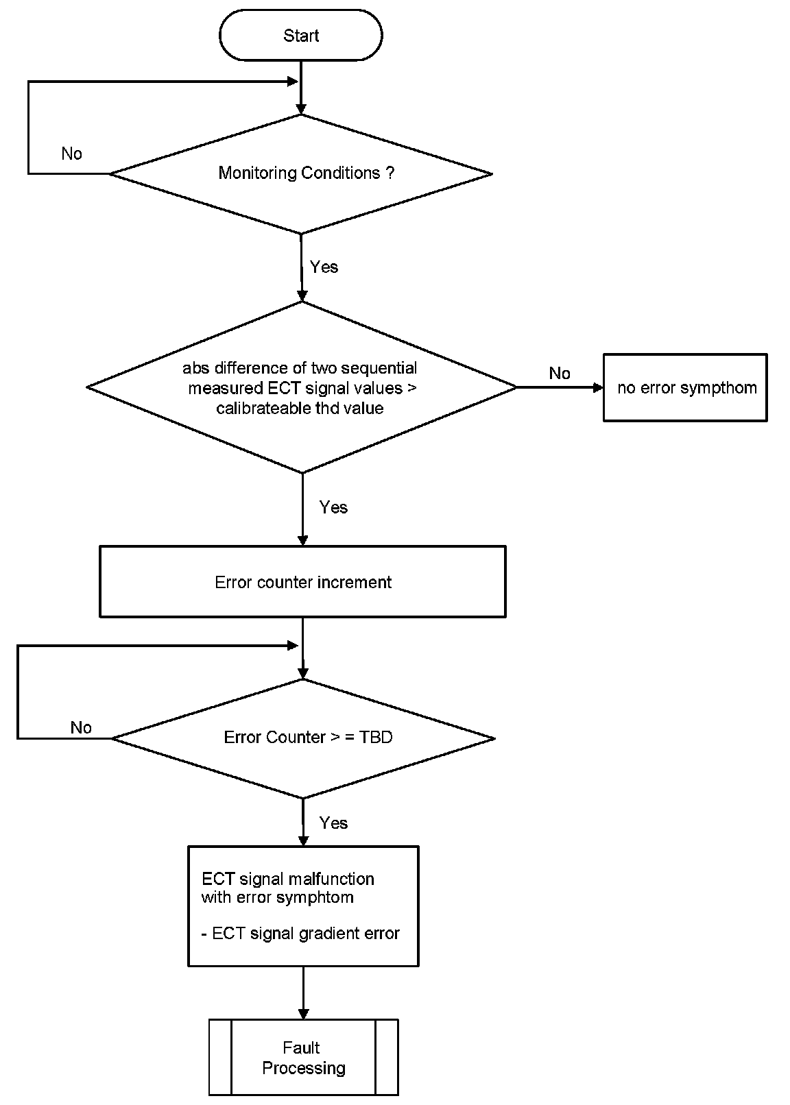 This coolant temperature plausibility diagnosis is performed once per engine run. At low ambient temperature a stuck open thermostat can cause an insufficient engine warm up. In the case that the coolant temperature is lower than the start temperature for coolant thermostat diagnosis a coolant temperature plausibility error will be detected.