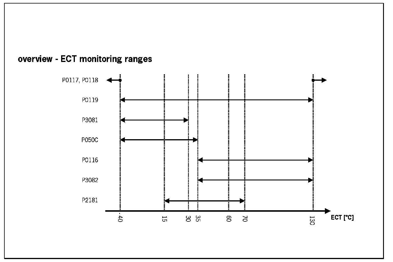 After engine start the system stores continuously the lowest and highest ECT. In case that after several driving conditions the difference between ECT max and ECT min is lower than the threshold the sensor stuck at high values.