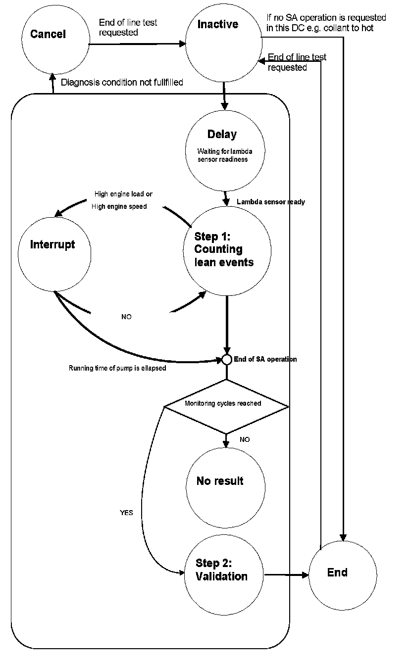 After completion of the secondary air function, the result of step 1 must be validated. If the number of monitoring cycles is reached the lambda controller is used to check if the mixture is in a "normal" (non lean) lambda-range thereby ensuring no lean-problem is present.
