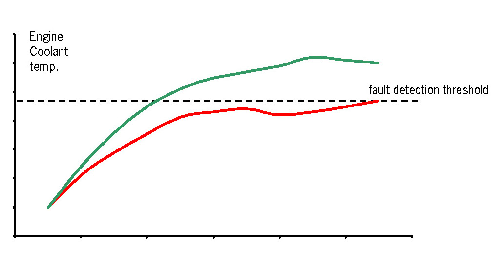 If under normal driving conditions the ECT signal is below this threshold a malfunctioning coolant thermostat is detected.