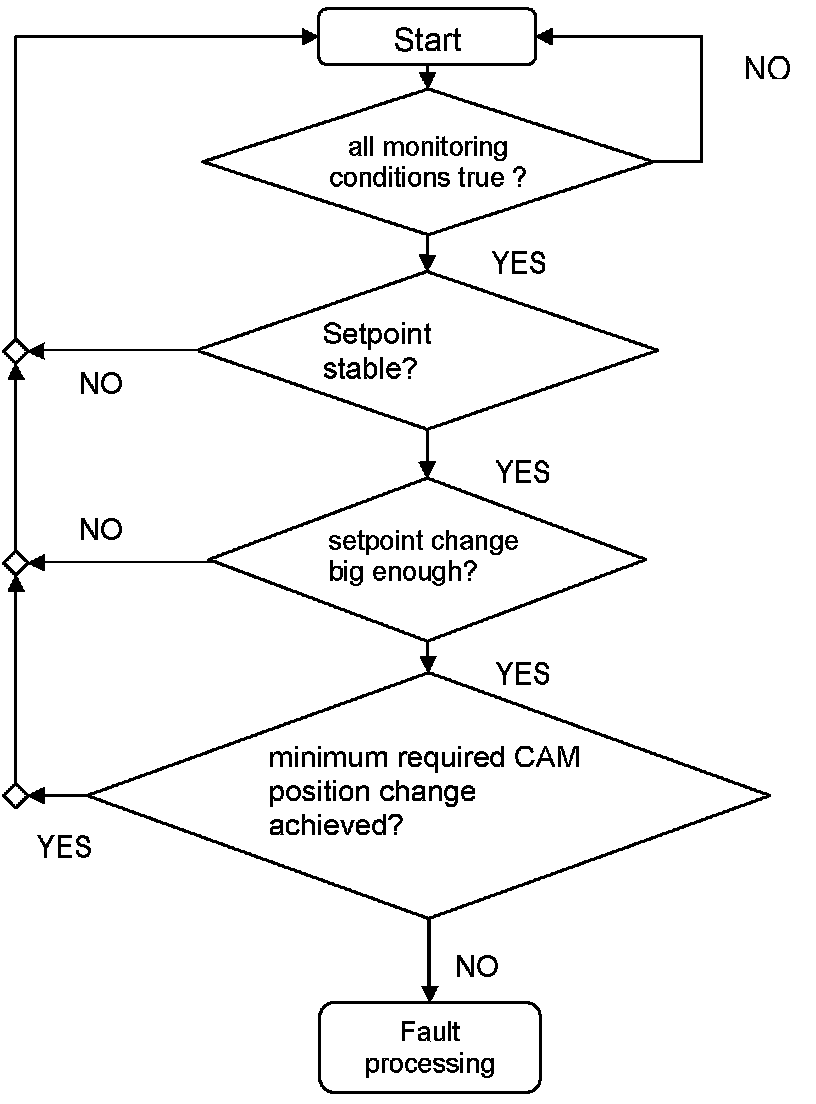 The set point and the camshaft position are saved at the beginning of a set point change. If this set point change is big enough (gradient), the camshaft phasing change is evaluated. If the change is smaller than a threshold, a slow response is detected, and if the value is greater, then there is no malfunction. By detecting a malfunction, the fault processing begins and a DTC is stored.