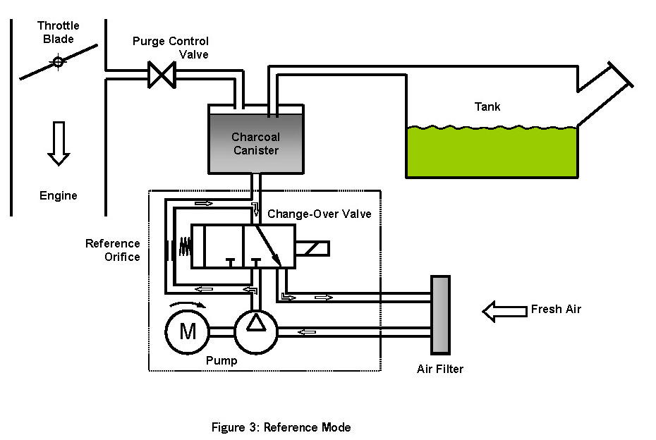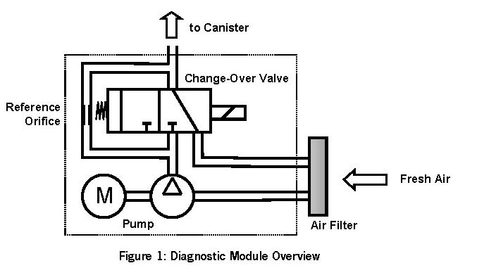 The DM-TL (Diagnostic Module Tank Leakage) is used for monitoring the evaporative system for small (more than 0.02 in) and rough (more than 0.04 in) leaks. It consists of an electrically driven air pump, a change-over valve and a 0.02 inch orifice for reference measurement - see Fig. 1. The tightness of the tank system is obtained by comparing the actual air pump's motor current with that measured when the system is operated with a standardized reference orifice.