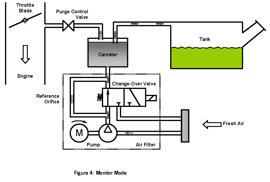 In the Monitoring Mode (Fig. 4) the change-over valve is switched on while the purge control valve remains closed. The motor current drops to a zero-load level. Fresh air is now pumped through the charcoal canister into the tank. A small overpressure, indicated by an increase in the motor current, builds up if the evaporative system is tight.