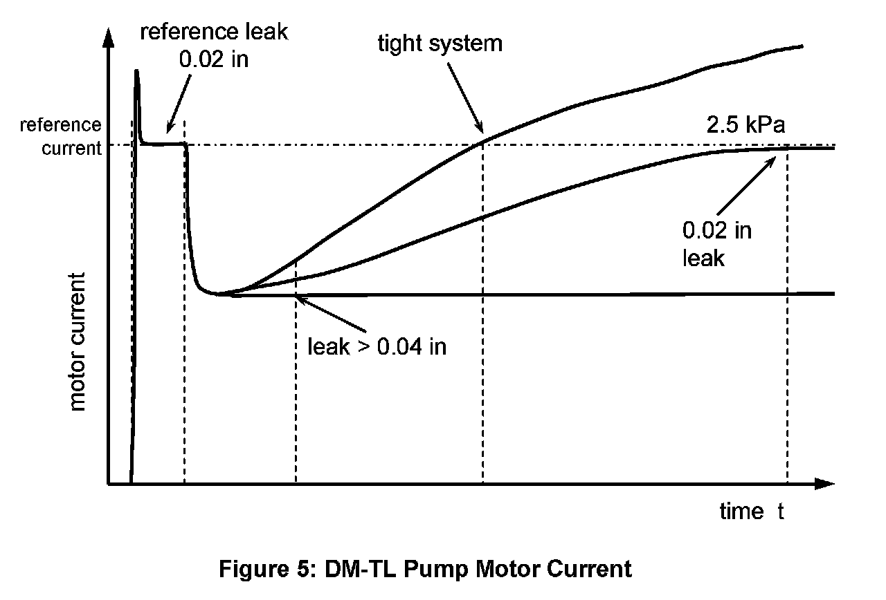 The small leak check is performed if and only if the rough leak check has been performed and no rough leak was detected. If the enable conditions for the small leak check (more than 0.02 in) are fulfilled, the pump's motor remains in the active state (monitoring mode) until its current exceeds the reference current, or the motor current gradient is close to zero (current stabilizes below the reference current). If the motor current exceeds the reference current, the evaporative system is considered as tight. A small leak is assumed only if a second small leak check confirms a current stabilization below the reference current.
