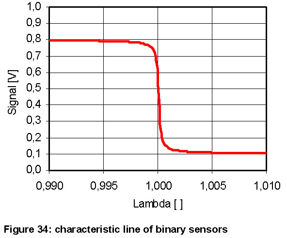 The binary oxygen sensor (other commonly used names are LSF or HEGO) measures also the oxygen content of the exhaust gas. The output voltage of this sensor is reading a level of > 0.45 V for a rich exhaust gas constitution. In case of a lean exhaust gas constitution, the sensor reads voltages < 0.45 V. For stoichiometric mixture (Lambda = 1) the characteristic line of the binary sensor has a steep gradient.