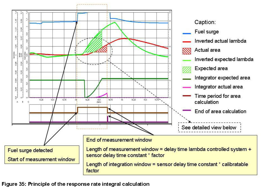 If there is an excessive delay in the oxygen sensor's response, no response to the fuel surge will be detected in the actual signal. As a result, no area integration can be done, and the area value for the actual signal is set to zero. Thus, the current area ratio also equals zero.