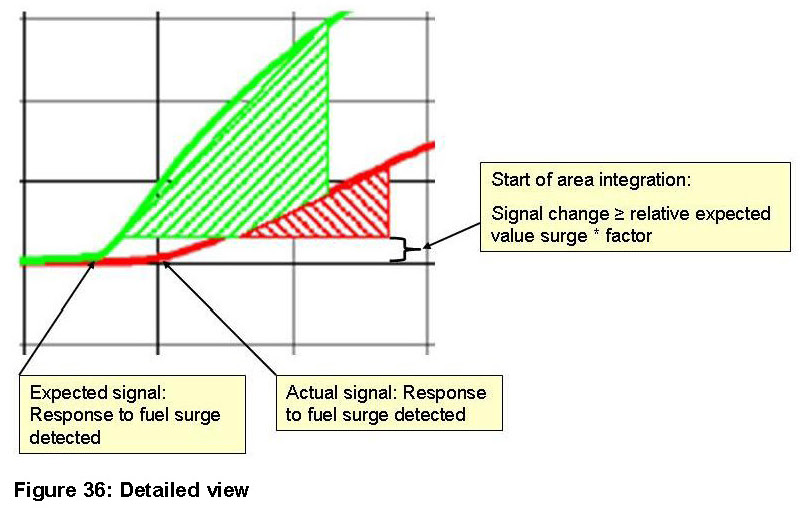 To initiate the calculation of the area integrals and the gradients, a relative fuel surge has to be detected. This fuel surge is detected when the difference between the current value and the previous fuel factor value exceeds a calibratable threshold value. Once a fuel surge is detected, both the setpoint and the actual value must respond within a certain time frame.
