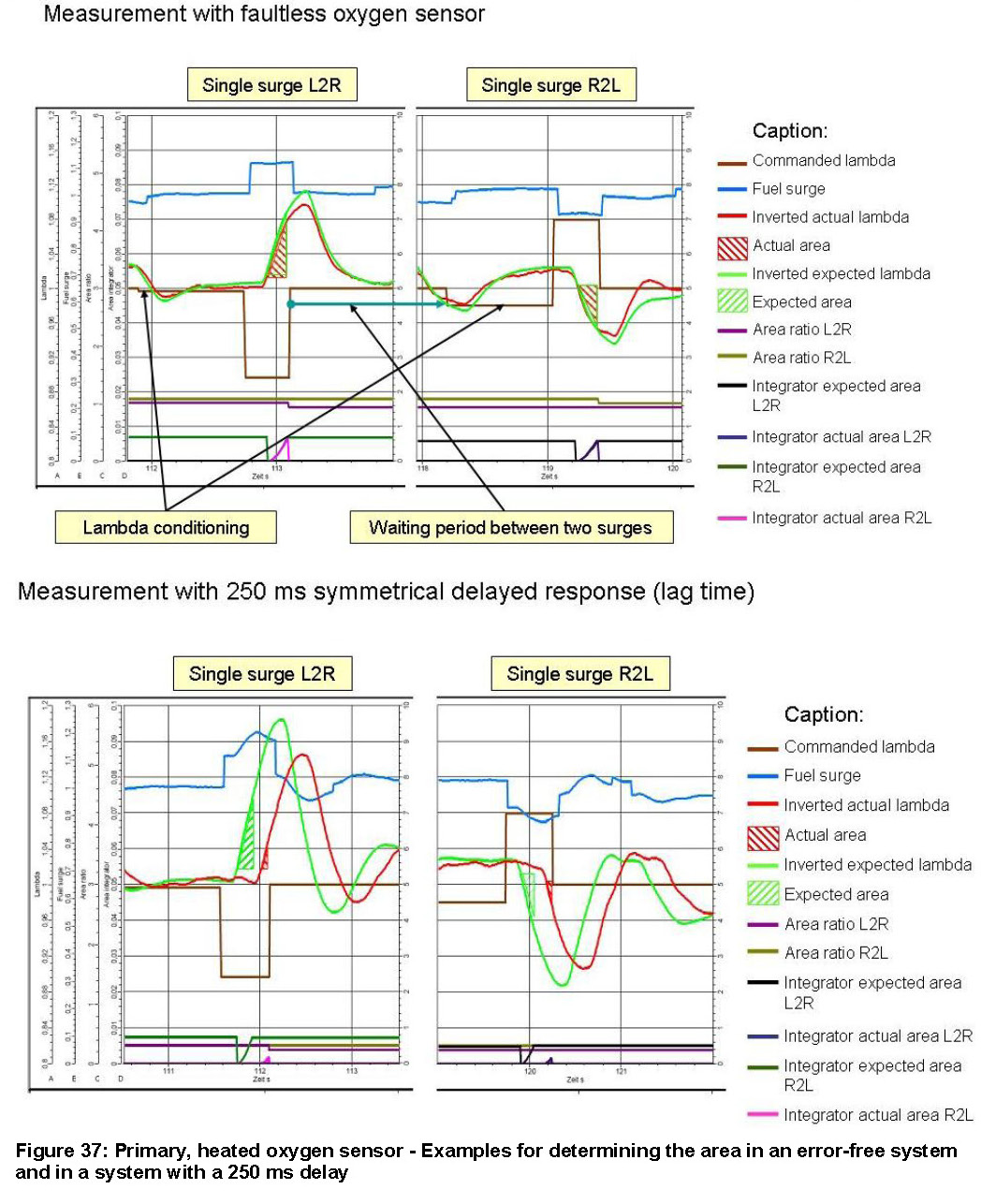 Due to the enleanment caused by the control action, the requested enrichment may not achieve the injection of the desired fuel quantity, when the modification of the setpoint lambda value is not synchronized with the control action. As a result, the necessary modification to measure the dynamic response of the sensor cannot be achieved. In case a slow oxygen sensor causes the lambda controller to oscillate, the falling slope of the control action line shows that the delayed sensor signal is responding to a preceding enrichment, i. e. the signal is moving towards "rich". The sensor signal is moving in the right direction, but not as a result of the previously initiated surge. Therefore a dynamic measurement may lead to a false result (e. g. an unjustified pass result).