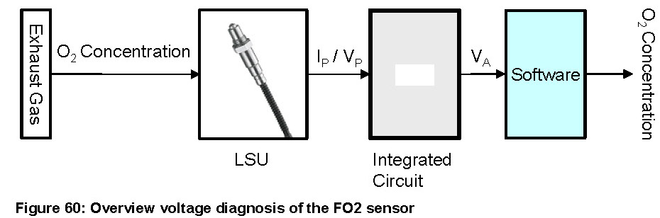 The diagnosis performs a range check of the voltage VA of the output signal of the heated wide band upstream oxygen sensor (HO2S) after amplification by the CJ125 integrated circuit. VA depends on the characteristics of the oxygen sensor itself and those of the peripheral circuitry of CJ125.