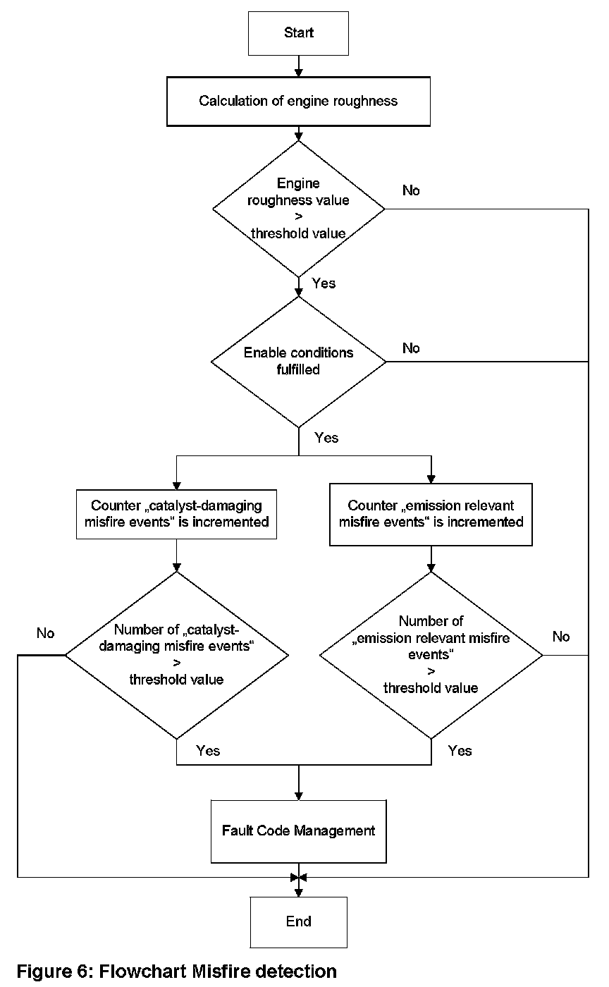 The crankshaft segment times are measured and these measurements are used to calculate the engine roughness values. If the engine roughness value is greater than a calculated threshold value, a misfire fault is detected. The threshold value for the engine roughness consists of a base value determined by means of geardependent characteristic engine-speed and load maps. According to the currently selected gear, the corresponding characteristic map is used (this applies to manual and automatic transmissions). During the engine warm-up a correction value, which depends on the engine temperature, is added to the base value.