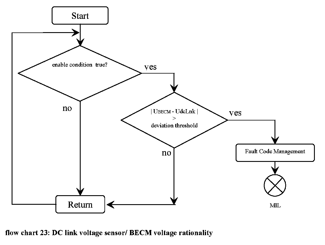 This monitoring strategy combines the DC link voltage and the high voltage battery voltage signal via CAN. If the deviation between both signals is too high, a DC link voltage sensor malfunction is detected. The high voltage battery voltage signal was monitored by the battery energy control system while its initialization phase. If the BECM has detected a voltage sensor malfunction the drive motor control module will not get into drive state and did not receive any this CAN message.
