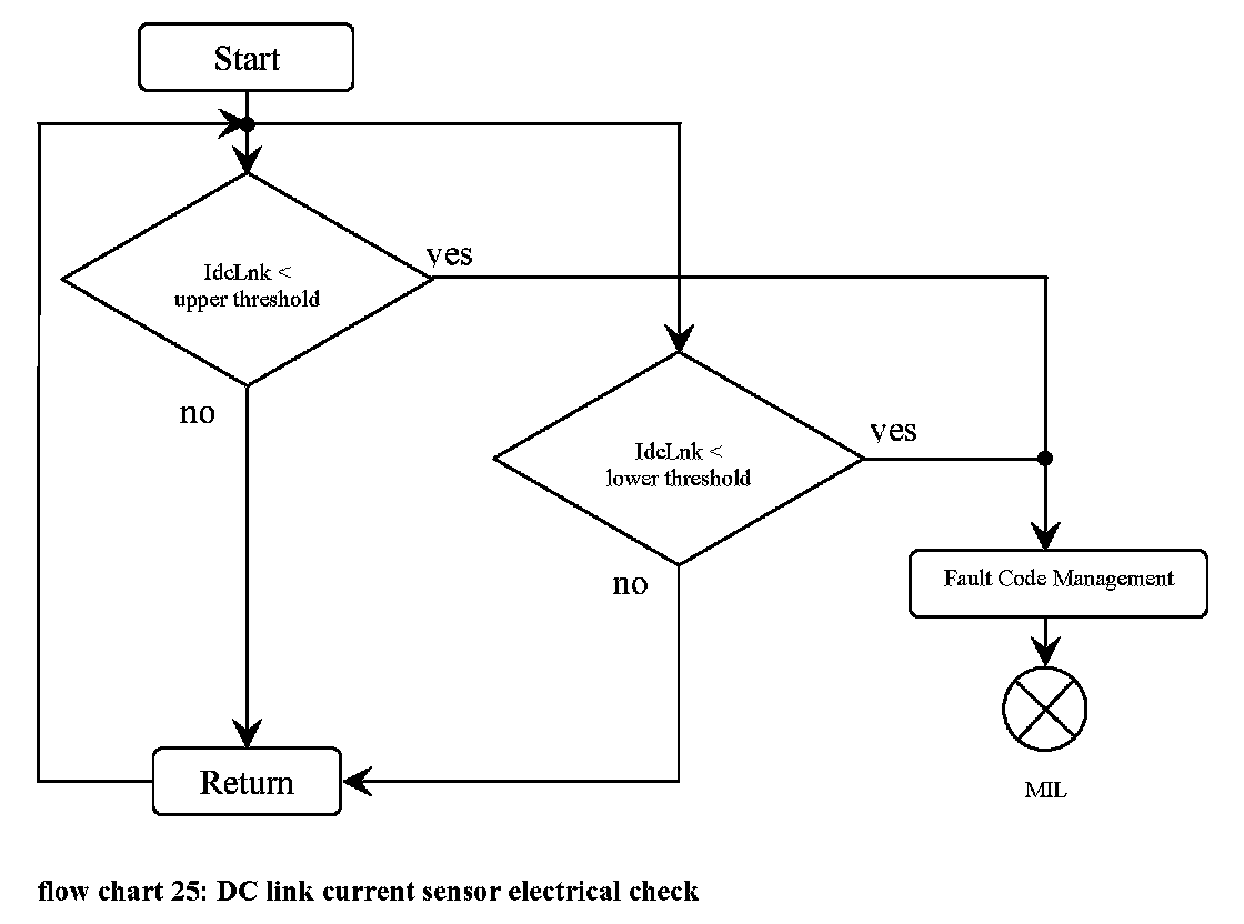 The DC link current sensor is checked by the output value. If the measured current value exceeds an upper or lower current threshold, a short cut to battery or short cut to ground is detected.