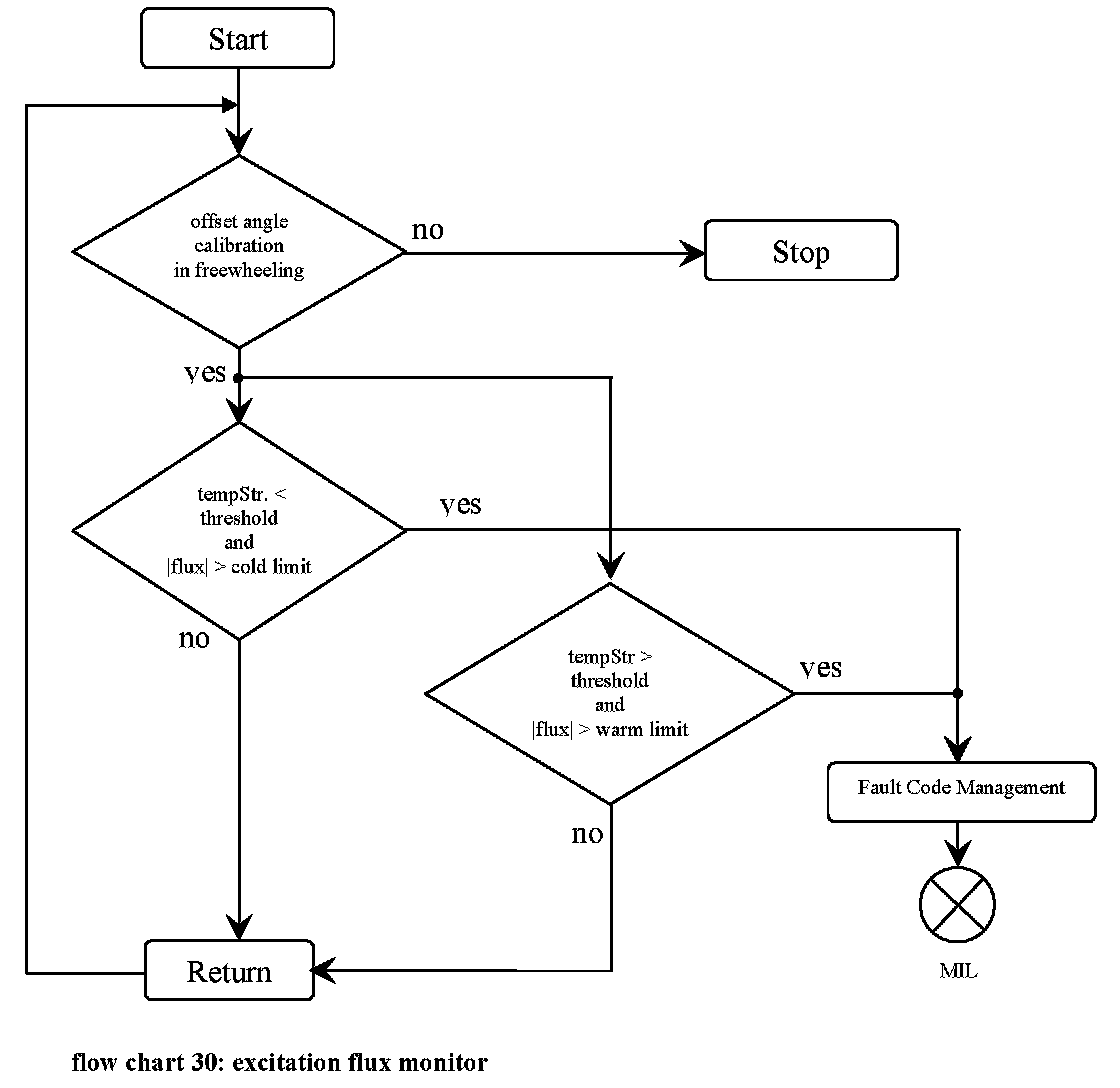 This function is enabled while offset angle calibration. Within the freewheeling phase, after the flux calibration this monitor evaluates the excitation flux of the drive motor. If this flux exceeds an upper or low limit a malfunction is detected. These limits are depending on the drive motor temperature. If under any temperature condition a malfunction is detected, the fault code will be stored.