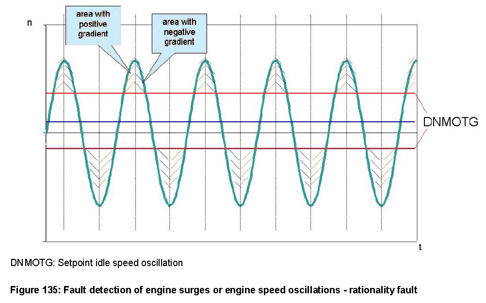 A rationality fault is detected when engine speed oscillations greater than the setpoint idle speed fluctuation permanently occur and the total sum of the areas formed from these positive and negative engine speed gradients exceed a calibratable threshold (see illustration below).