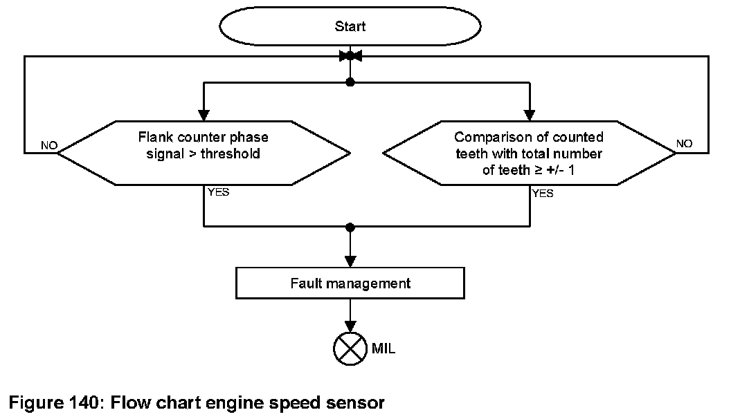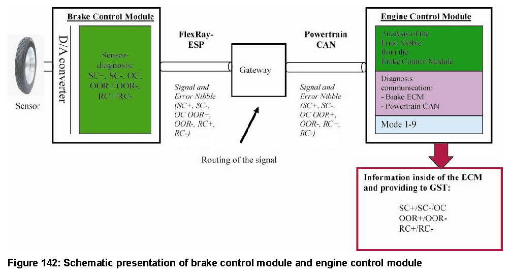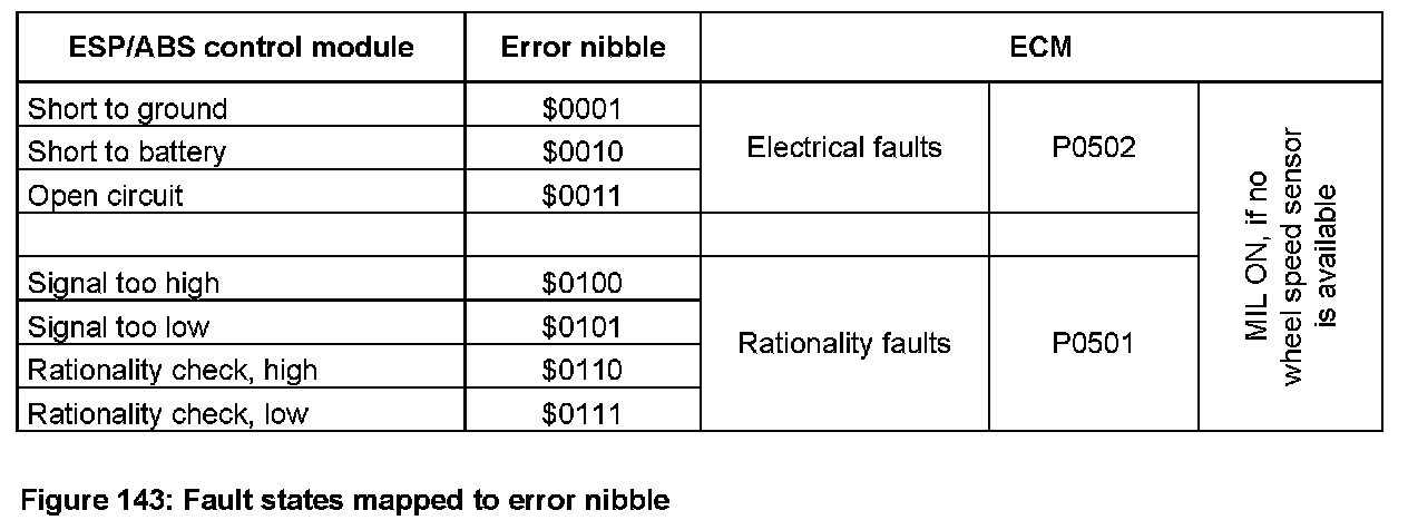 The vehicle speed signal faults detected by the ESP/ABS control module are transmitted to the ECM via the FlexRay/CAN bus by means of an OBD error nibble (= half-byte = 4 bits) which contains the fault information of each wheel speed sensor. Obtaining the fault information, the ECM forwards it to its fault memory. A fault code is only registered in the ECM if none of the wheel speed sensors provides the ESP/ABS control module with a valid signal, and thus the MIL is commanded on if none of the wheel speed sensors is fault-free.