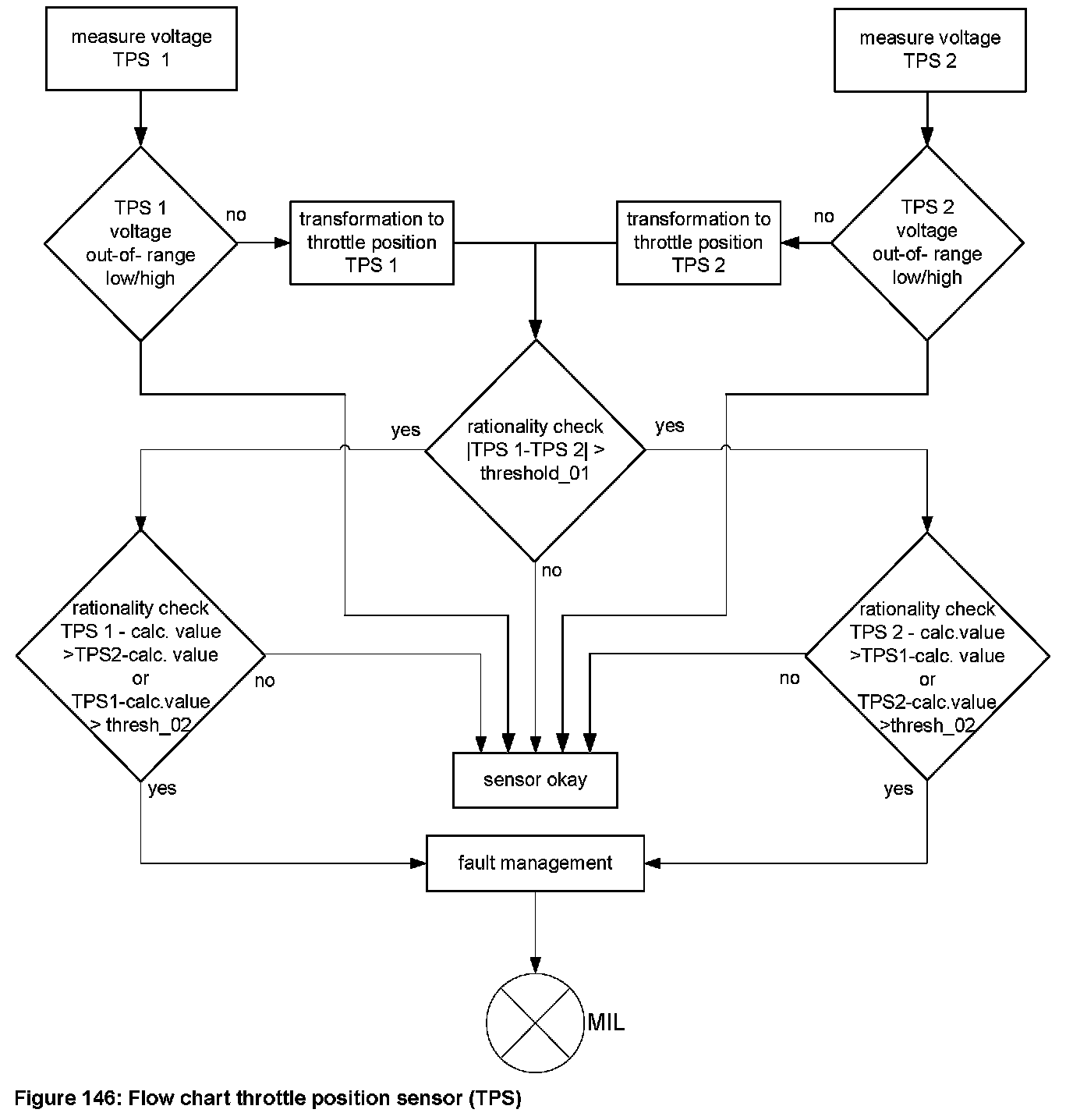The throttle body consists of two potentiometers (reversed voltage logic). During the first start, the potentiometer characteristics are adapted and stored. The diagnosis monitors the corrected values of potentiometer 1 and 2. In case of a higher difference than a threshold value both signals are compared to the engine load to determine and disable the faulty one. A fault code will be stored and the MIL will be illuminated.
