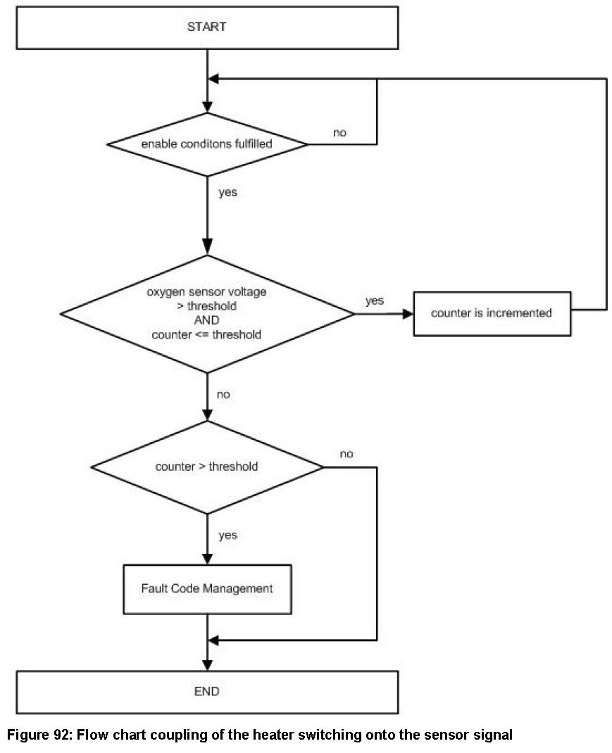 If the above threshold value is exceeded, a counter is incremented. When this counter exceeds the respective threshold value, the fault P0136 for the rear sensor of bank 1 is set, and the operational readiness is withdrawn.