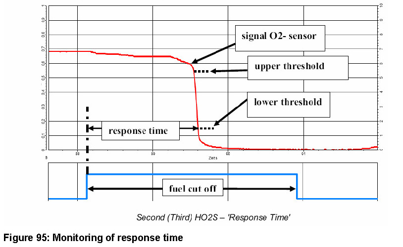 Once fuel cut-off is present, the response time is defined as the O2S signal time needed to fall below a certain voltage level (typical value: ~0.15 V). This part of the diagnostic replaces the former diagnostic of the O2S agingmonitor (DLSAHK) conducted during fuel cut-off.