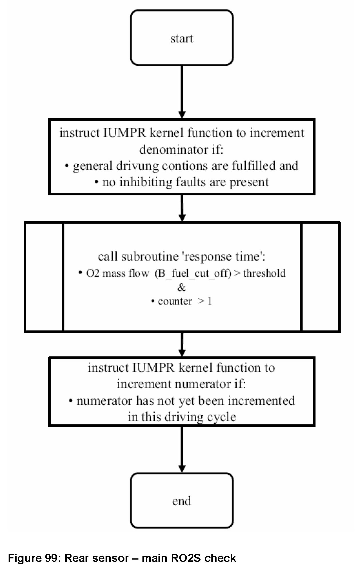The incrementing of the numerator, the denominator and the ratio calculation for the HO2S 'Response Rate' monitor is executed by the "IUMPR-Kernel" as a subroutine. Like all monitors for which a standardized tracking and reporting of the in-use performance is required, the HO2S "Response Rate" monitor reports to the "IUMPR Kernel"-function via status flags.