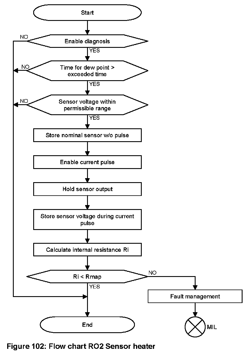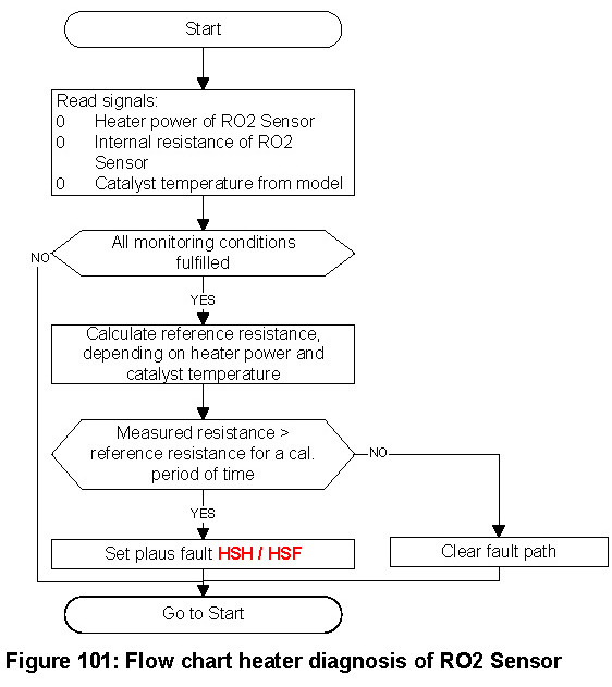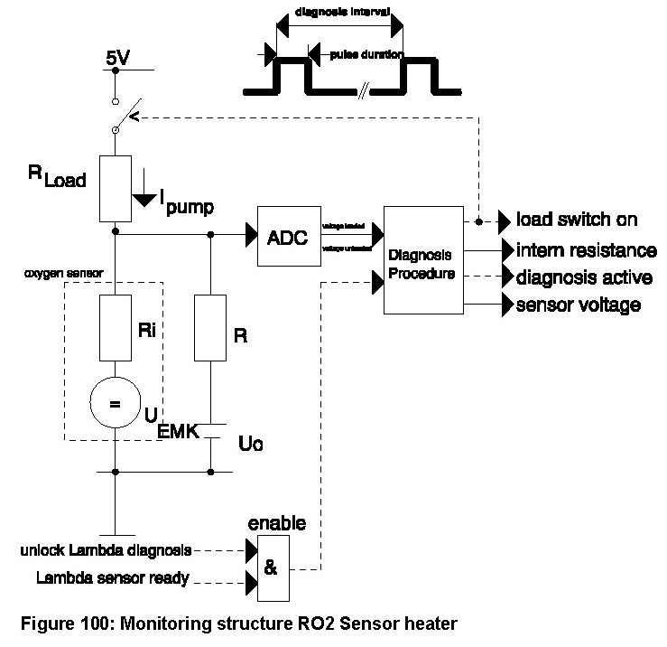 For diagnostic of the sensor heater a specific current pulse is supplied via a load resistance and the voltage is measured. The intern resistance of the sensor heater is calculated with the voltage deviation. The result will be compared with a reference resistance map which considers ageing and sampling deviations. In case of internal resistance > map resistance the diagnosis stores a fault and the MIL will be illuminated.