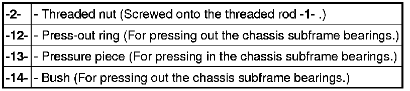 The nut -2- must be locked in the process with the contact surface on the press-in plate -7- ! The press-in plate -7- must be positioned perfectly on the bearing sleeve on the chassis subframe. (Get another worker to help if necessary!) This prevents the bearing from being drawn in at an incorrect angle.