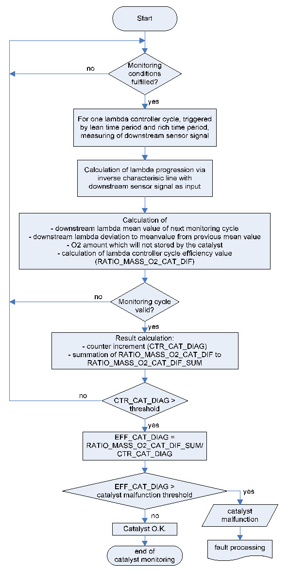 The first lean to rich cycle is only used to establish an average voltage value of the downstream sensor voltage. During subsequent lambda controller cycles the oxygen storage capacity (OSC) is based on the integrated (accumulated) value of the difference between the average value of the previous lean to rich cycle and the measured instantaneous voltage during the current lean to rich cycle. This surface integral will be normalized, weighted and corrected and is a measure of the catalyst efficiency. The catalyst system is considered malfunctioning, if after a specified number of monitoring cycles the average of the single efficiency values exceeds a threshold. The corresponding fault code is stored.