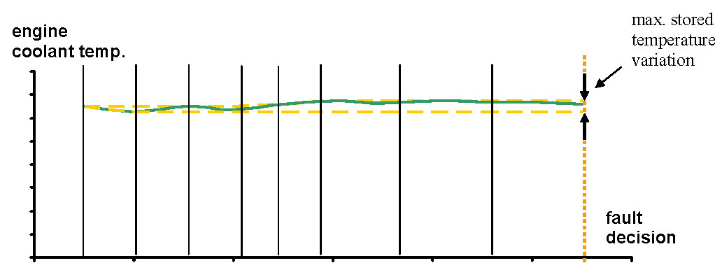 After engine start the system stores continuously the lowest and highest ECT. In case that after several driving conditions the difference between ECT max and ECT min is lower than the threshold stuck signal error is detected.