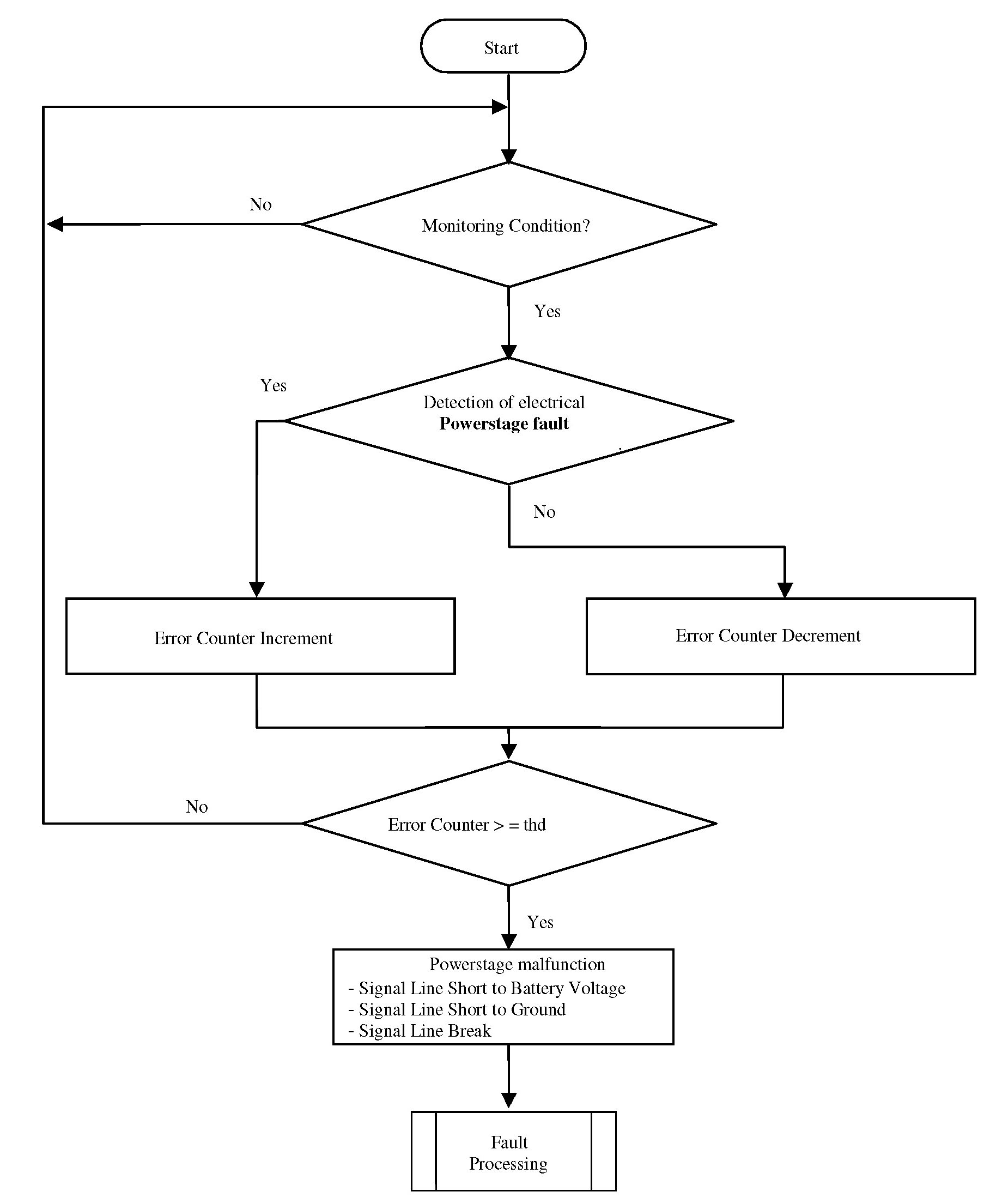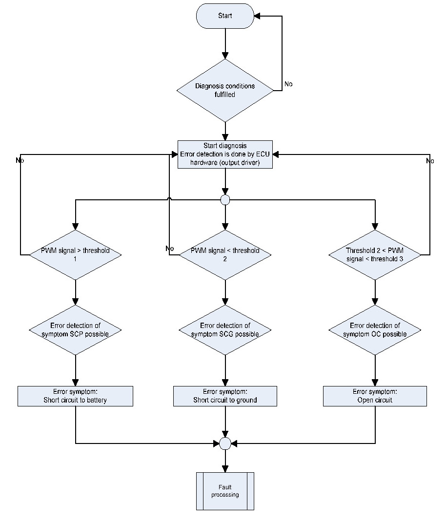 Invalid actuator output signals at power stage are regarded as circuit malfunctions shorted to BATT, GND or Open circuit.
