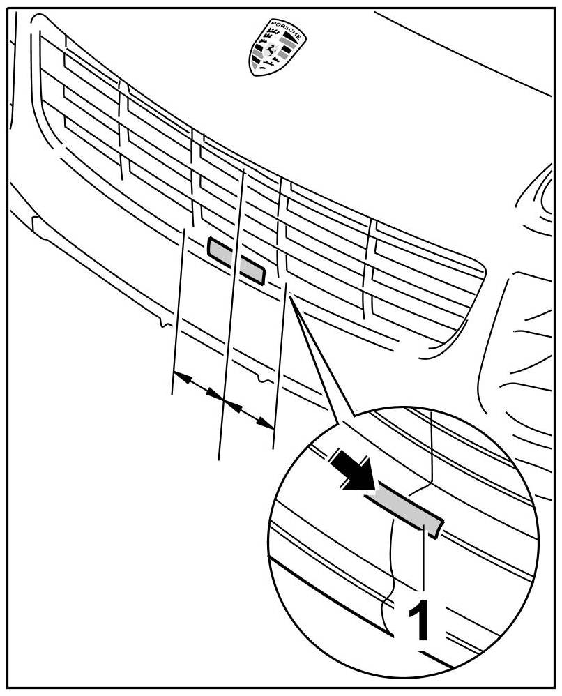 1.3. Find the centre between the vertical shafts on the air grille and mark this spot on the adhesive tape -1- affixed to the front apron -arrow-.