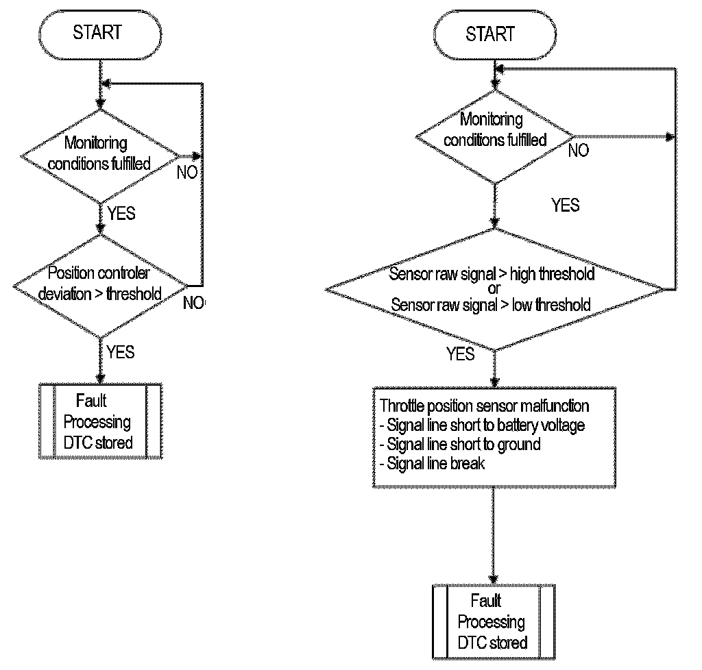 The task of this diagnosis is to detect a throttle valve error or a jammed ETC actuator. The diagnosis observes the ETC position controller system deviation TPS_DIF dependent on the gradient of the throttle position setpoint. The anti-bounce of the error detection is done by the generic error management. The increment and decrement value of the anti-bounce algorithm can be calibrated.