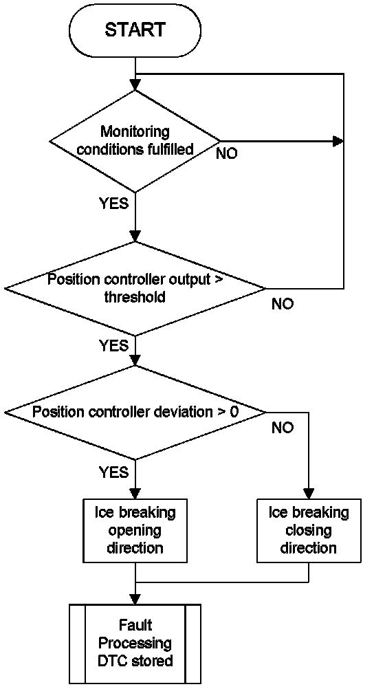 In case of very low temperatures it is possible that the throttle actuator is jammed by ice. The functionality is used for the detection and the removing of ice between throttle flap and body. The functionality is able to detect the location of the throttle flap disturbance and can distinguish ice in closing and opening throttle flap direction.