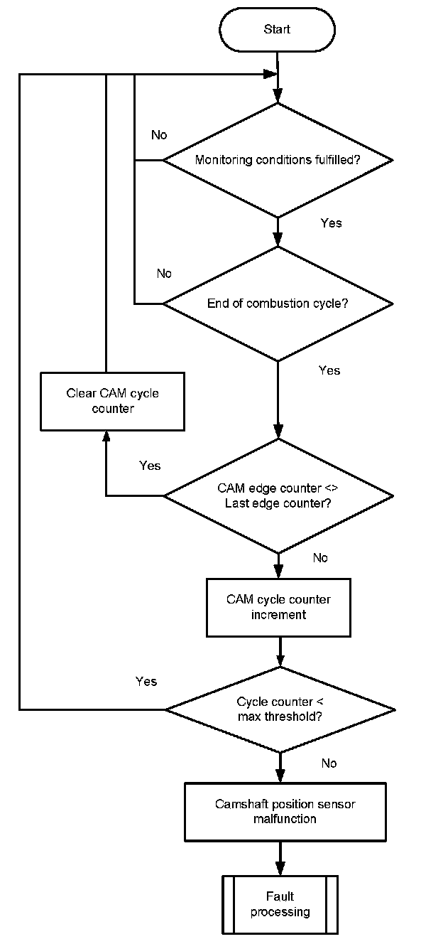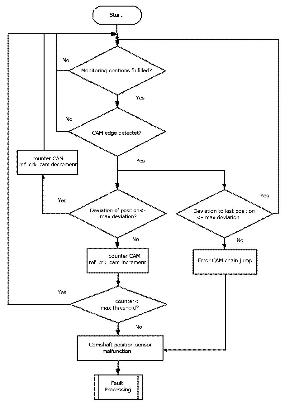 The monitor checks once per combustion cycle the edge counter of the camshaft. If the edge counter has not changed during the last cycle, a cycle counter is incremented. When the counter reaches a threshold, the error CAM_plaus is delivered to the error management.