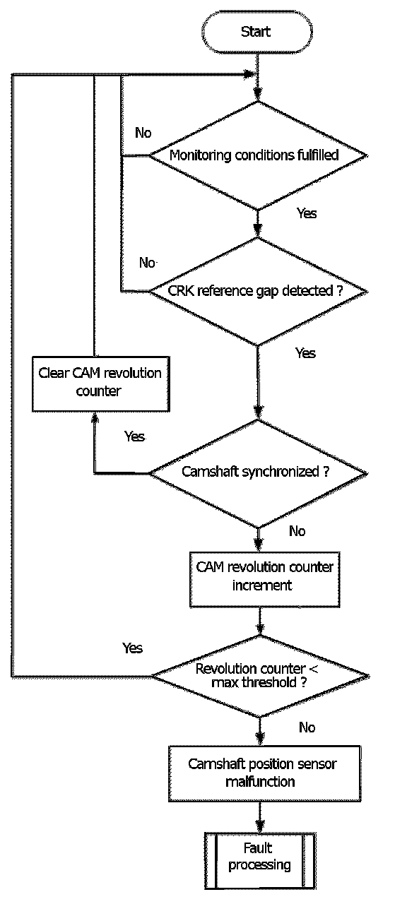 The monitor checks at every reference gap of the crankshaft sensor signal whether the camshaft is synchronized or not. If the camshaft is not synchronized, a revolution counter for the camshaft is incremented. When the counter reaches a threshold the error CAM sync is delivered to the error management.