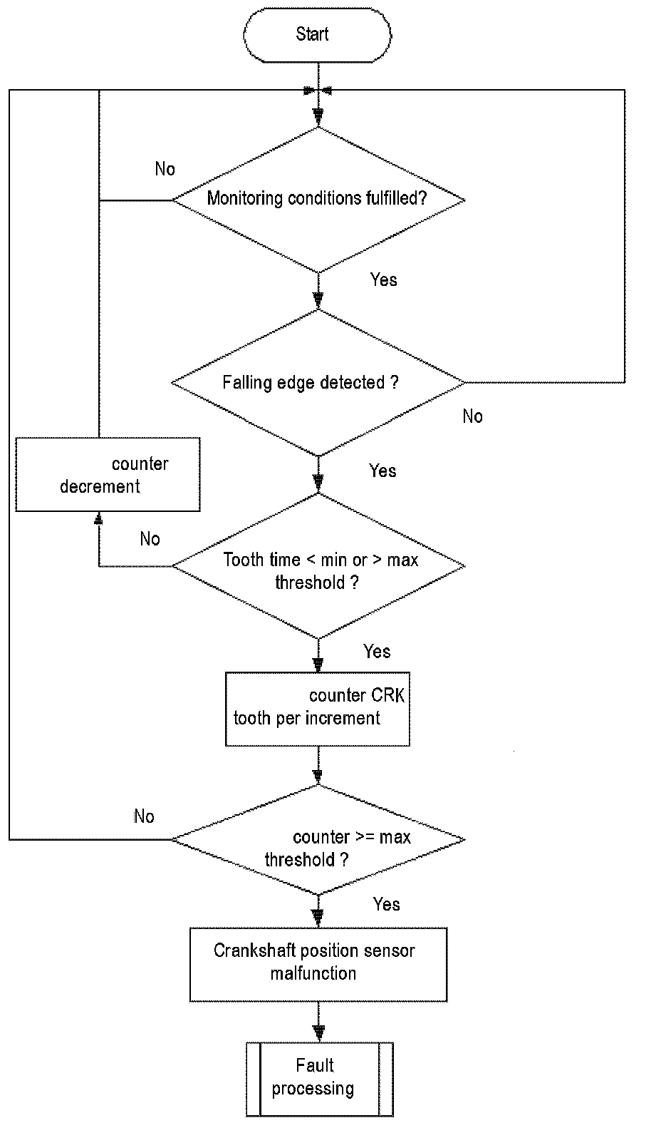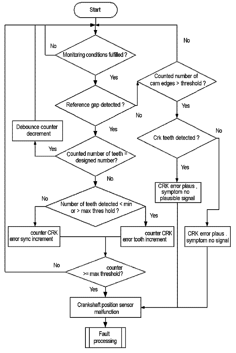 A teeth counter is incremented at every falling edge of the CRK sensor signal. If plus or minus one tooth is detected Flowchart diagnosis of mechanical reference position and diagnosis of chain jump. 360 °CA at the reference gap, the tooth number counter will be incremented. If the counter exceeds a limit, a CRK tooth error is delivered to the error management.