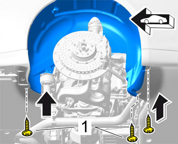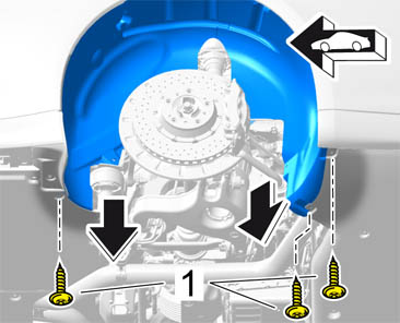 7. Screw in fastening screws -1- securing the wheel housing liner to the heat protection panel.