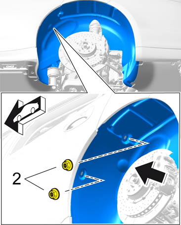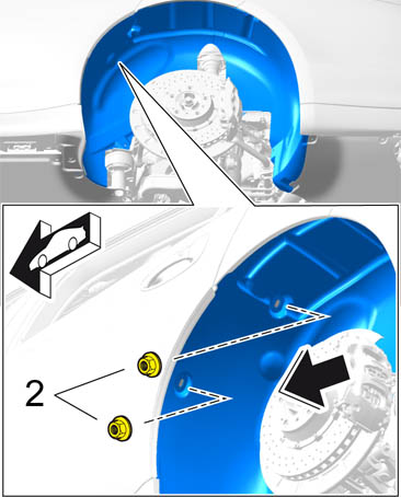 2. Screw in plastic nuts -2- on the inside of the wheel housing liner.