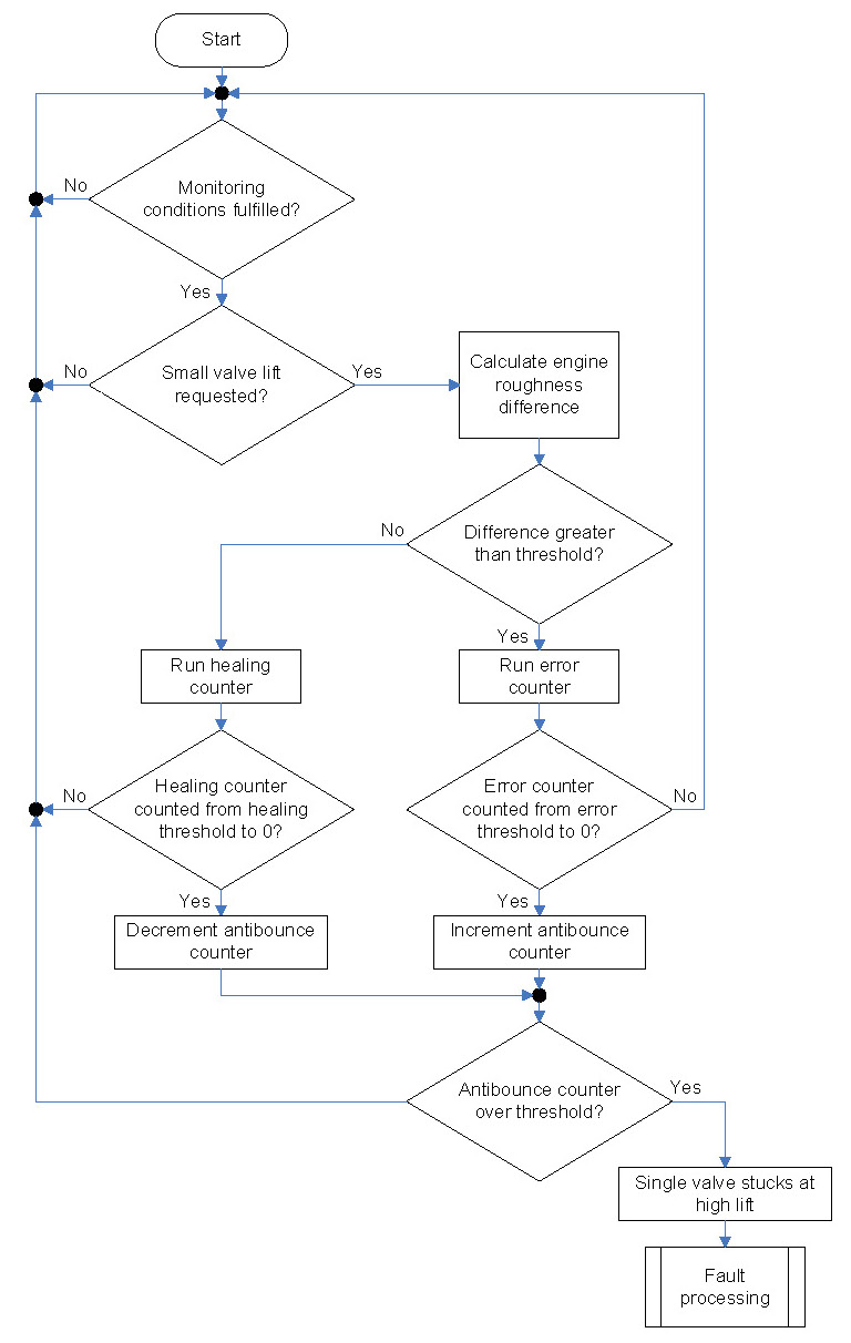 This diagnosis monitors whether a single inlet valve stuck at the high valve lift. This disturbs the gas exchange process of the concerned cylinder. The engine speed roughness of this cylinder changes. The difference of this engine roughness and of the roughness of a reference cylinder, e.g. the proceeding cylinder or the cylinder 360 °CA before) is taken for the monitoring. If this difference exceeds a threshold for a certain time the failure is detected. A check of the closed loop regulator during part load is performed to distinguish between misfire and a valve lift fault. The algorithm is the same for each cylinder.