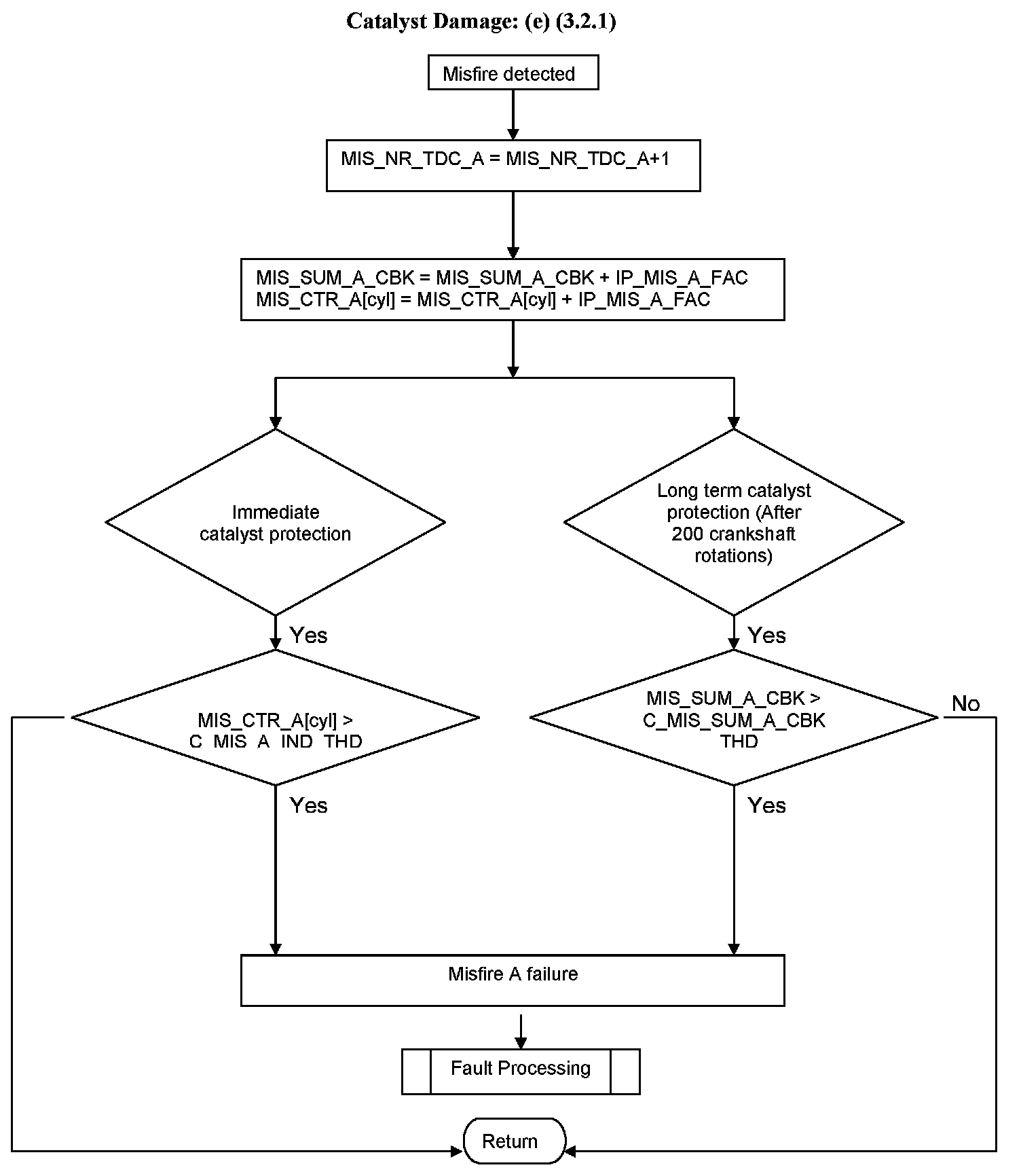 If the weighted sum of individual cylinder(s) misfire counters within 200 rotations is exceeding a predetermined value, or the weighted sum of misfire counter per bank exceeds a predetermined value at the end of 200 rotations, then the fault code for catalyst damage relevant misfiring is stored and the cylinder with the highest rate will be switched off, and the MIL will be switched on immediately.