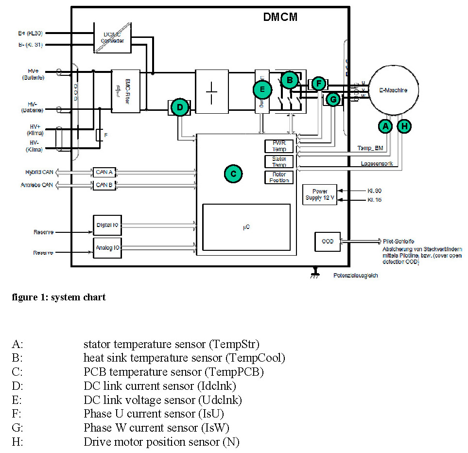 1 Description Of The DMCM With Relevant Actuators And SensorsThe DMCM (drive motor control module) controls the function of the electric drive motor during the driving cycle and in post- and pre drive. The following figure shows the DMCM with connectors to its periphery including the connectors to the high voltage battery (HVB) and the vehicle CAN.