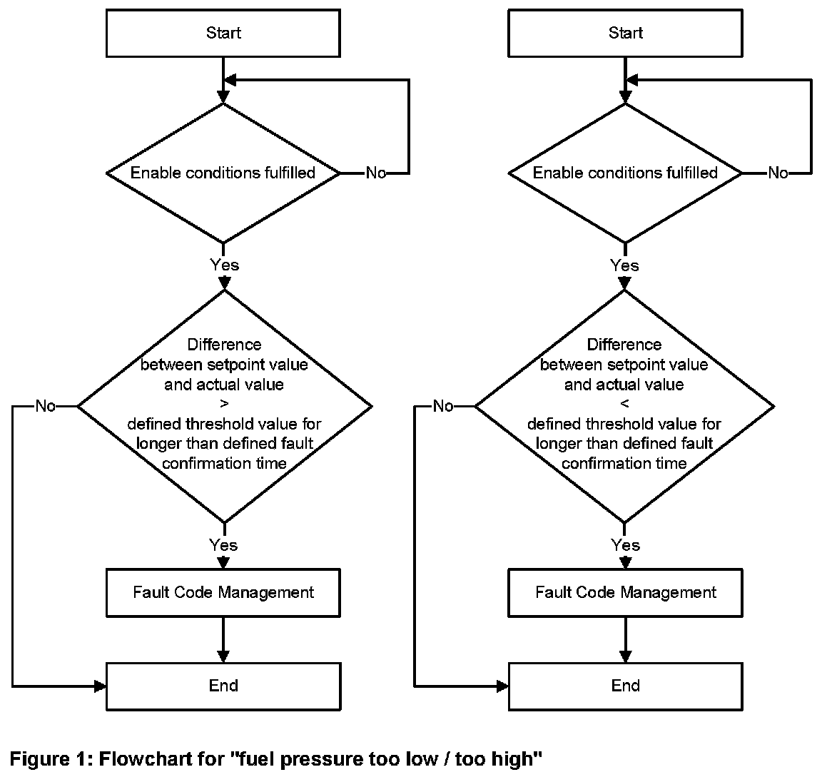 The fuel pressure measured in the distributor rail is compared to the value defined by the engine control unit. The difference between the setpoint value and the actual value is evaluated.